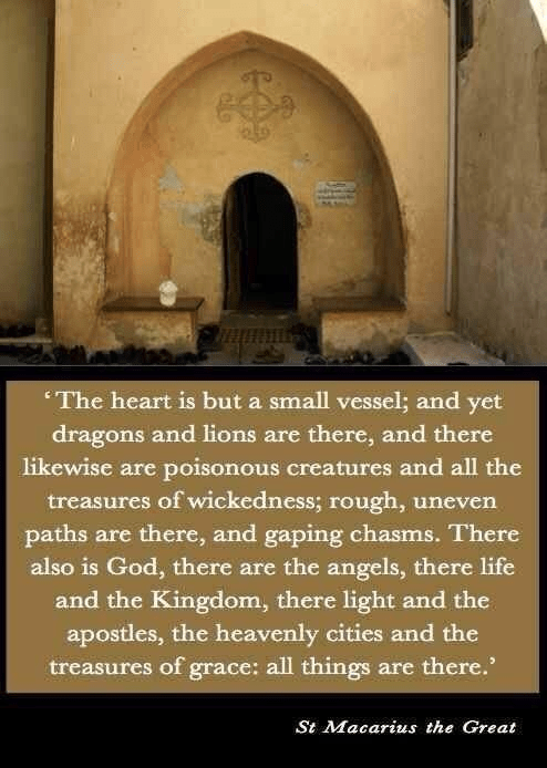 “Het hart is maar een klein vat; en toch zijn er draken en leeuwen en er zijn eveneens giftige wezens en alle schatten van goddeloosheid; ruwe oneffen paden zijn er en gapende afgronden. Daar is ook God, daar zijn de engelen, daar is het leven en het Koninkrijk, daar is het licht en de apostelen, de hemelse steden en de schatten van genade: alle dingen zijn daar.” – St. Macarius de Grote