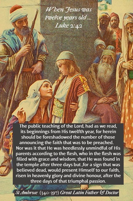 “De openbare leer van de Heer had, zoals we lezen, haar oorsprong vanaf Zijn twaalfde jaar, want hierin moest het aantal van hen worden voorafschaduwd die het geloof verkondigden dat gepredikt moest worden. Het was ook niet zo dat Hij achteloos onachtzaam was voor Zijn ouders naar het vlees, die in het vlees vervuld waren met genade en wijsheid, dat Hij na drie dagen in de tempel werd gevonden, maar dat een teken dat men dood geloofde, Zich aan ons geloof zou aanbieden, opstond in hemelse heerlijkheid en goddelijke eer. na de drie dagen van die triomfantelijke passie.