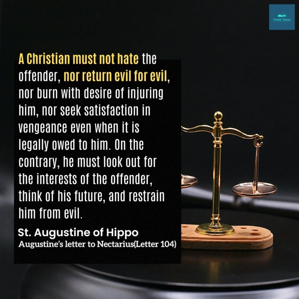 “Een christen mag de overtreder niet haten, noch kwaad met kwaad vergelden, noch branden van verlangen om hem te kwetsen, noch voldoening zoeken in wraak, zelfs als het hem wettelijk verschuldigd is. Integendeel, hij moet de belangen van de overtreder behartigen, aan zijn toekomst denken en hem van het kwaad weerhouden.”