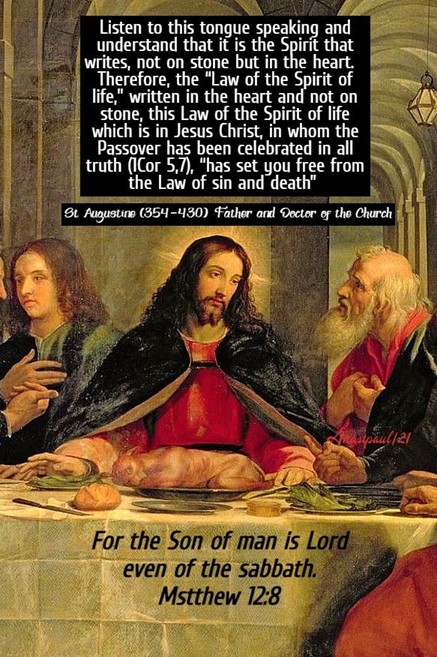 .. Luister naar deze tongentaal en begrijp dat het de Geest is die schrijft, niet op steen maar in het hart. Daarom heeft de “Wet van de Geest van het leven”, geschreven in het hart en niet op steen, deze Wet van de Geest van het leven, die in Jezus Christus is, in wie het Pascha in alle waarheid is gevierd (1Kor 5,7), “u bevrijd van de Wet van de zonde en de dood” (Rom 8,2).