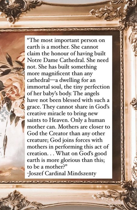 “De belangrijkste persoon op aarde is een moeder. Zij kan niet de eer opeisen de Notre Dame kathedraal te hebben gebouwd. Dat hoeft ook niet. Zij heeft iets prachtigers gebouwd dan welke kathedraal dan ook—een verblijfplaats voor een onsterfelijke ziel, de kleine perfectie van het lichaam van haar baby—De engelen zijn niet gezegend met zo’n genade. Zij kunnen niet delen in Gods scheppende wonder om nieuwe heiligen naar de hemel te brengen. Alleen een menselijke moeder kan dat. Moeders staan dichter bij God de Schepper dan enig ander schepsel; God bundelt de krachten met moeders om deze scheppingsdaad uit te voeren… Wat op Gods goede aarde is glorieuzer dan dit; moeder zijn?”