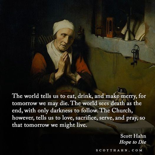 De wereld vertelt ons om te eten en vrolijk te zijn, want morgen kunnen we sterven. De wereld ziet de dood als het einde, met alleen duisternis als gevolg. De Kerk vertelt ons echter om lief te hebben, te offeren, te dienen en te bidden, zodat we morgen kunnen leven.