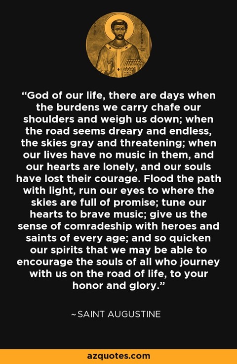 God van ons leven, er zijn dagen dat de lasten die we dragen onze schouders schuren en ons neerdrukken; wanneer de weg somber en eindeloos lijkt, de lucht grijs en bedreigend; wanneer onze levens geen muziek in zich hebben, en onze harten eenzaam zijn, en onze zielen hun moed hebben verloren. Overstroom het pad met licht, laat onze ogen gaan naar waar de luchten vol belofte zijn; stem onze harten af op dappere muziek; geef ons het gevoel van kameraadschap met helden en heiligen van alle tijden; en versnel zo onze geesten dat we de zielen van allen die met ons op de weg van het leven reizen, kunnen aanmoedigen, tot uw eer en glorie.