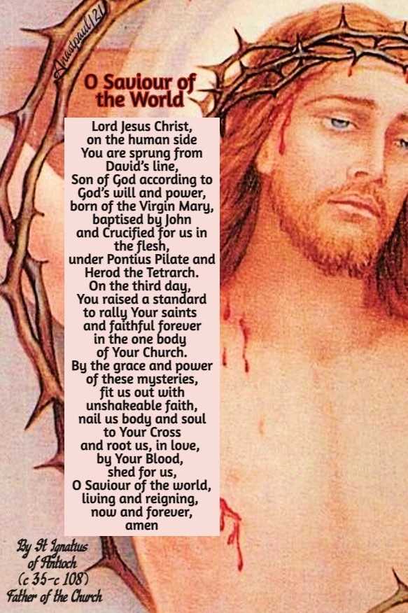 en wortel ons, in liefde, door Uw Bloed, voor ons vergoten, o Redder van de wereld, levend en heersend, nu en in eeuwigheid,