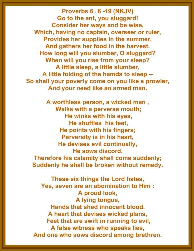 Ga naar de mier, gij luiaard [Ga tot de mier, gij luiaard! zie haar wegen, en word wijs], bekijk haar gedrag en word wijs. Zij heeft geen aanvoerder, geen opzichter, geen heerser, maar zij zorgt toch ’s zomers voor haar proviand en slaat in de oogsttijd haar voedsel op. Hoe lang blijft gij nog liggen, luiaard? Wanneer staat gij op uit uw slaap? Nog even slapen, nog even rusten, nog even de armen over elkaar en liggen! Zo overvalt u de armoede als een rover, het gebrek als een welbewapend man. Een booswicht is het, een slechtaard, de man die rondgaat met leugenachtige mond, die knipoogt, die met zijn voeten schuifelt, die met zijn vingers wijst. Zijn hart zit vol slinkse streken; hij smeedt altijd maar kwalijke plannen en brengt ruzie teweeg. Daarom zal het verderf hem eensklaps overvallen en zal hij ineens gebroken worden, onherstelbaar. Dit zijn zes dingen, die Jahwe verfoeit, ja, zeven, die Hem een gruwel zijn: hoogmoedige ogen, een leugenachtige tong en handen die onschuldig bloed vergieten, een hart dat misdadige plannen smeedt en voeten die zich haastig reppen naar het kwade, een valse getuige die leugens uitslaat en degene die onder broeders ruzie teweegbrengt.