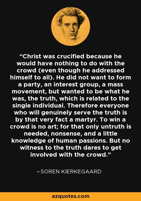 Christus werd gekruisigd omdat hij niets met de massa te maken wilde hebben (ook al richtte hij zich tot iedereen). Hij wilde geen partij, belangengroep, massabeweging vormen, maar wilde zijn wat hij was, de waarheid, die betrekking heeft op het individu. Daarom is iedereen die oprecht de waarheid wil dienen, door dat feit al een martelaar. Een massa winnen is geen kunst; daarvoor is alleen onwaarheid, onzin en een beetje kennis van menselijke passies nodig. Maar geen enkele getuige van de waarheid durft zich met de massa te bemoeien.