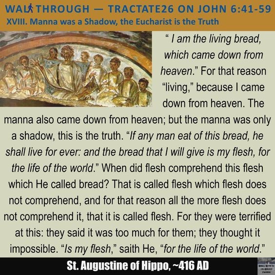 Ik ben het levende brood dat uit de hemel is neergedaald. Om die reden leef ik, omdat ik uit de hemel ben neergedaald. Het manna daalde ook uit de hemel neer; maar het manna was slechts een schaduw, dit is de waarheid . Als iemand van dit brood eet, zal hij voor altijd leven: en het brood dat ik zal geven is mijn vlees, voor het leven van de wereld. Dat wat vlees niet begrijpt, wordt vlees genoemd, en daarom des te meer begrijpt vlees niet, dat het vlees genoemd wordt. Want zij waren hierdoor verschrikt: zij zeiden dat het hun te veel was, zij achtten het onmogelijk. “Is mijn vlees,” zegt Hij, “voor het leven der wereld.”