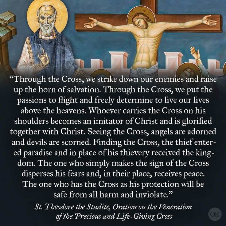 “Door het kruis slaan we onze vijanden neer en heffen we de hoorn van verlossing op. Door het kruis zetten we de hartstochten op de vlucht en besluiten we vrij om ons leven boven de hemelen te leven. Wie het kruis op zijn schouders draagt, wordt een navolger van Christus en wordt samen met Christus verheerlijkt. Bij het zien van het kruis worden engelen versierd en duivels veracht. Bij het vinden van het kruis ging de dief het paradijs binnen en in plaats van zijn diefstal ontving hij het koninkrijk. Degene die eenvoudigweg Degene die eenvoudig het kruisteken maakt, verdrijft zijn angsten en ontvangt in plaats daarvan vrede. Degene die het kruis als zijn bescherming heeft, zal veilig zijn voor alle kwaad en onschendbaar.”