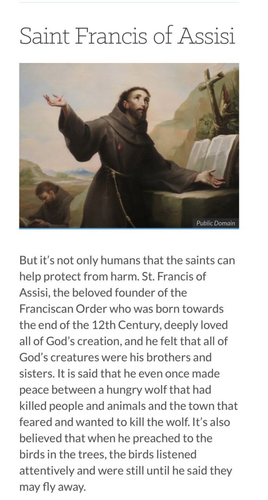 Maar het zijn niet alleen mensen die de heiligen kunnen helpen beschermen tegen onheil. Sint Franciscus van Assisi, de geliefde stichter van de Franciscaanse orde, die tegen het einde van de 12e eeuw werd geboren, ‘had een diepe liefde