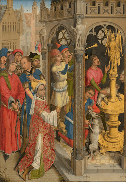Navolger van Rogier van der Weyden, Sint Augustinus offert aan een Manicheïstische afgod