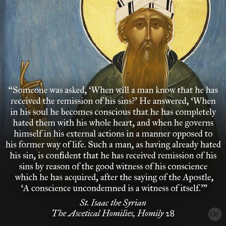 Iemand werd gevraagd: ‘Wanneer zal een mens weten dat hij de vergeving van zijn zonden heeft ontvangen?’ Hij antwoordde: ‘Wanneer hij zich in zijn ziel bewust wordt dat hij ze volledig met heel zijn hart heeft gehaat, en wanneer hij zichzelf in zijn uiterlijke daden bestuurt op een manier die tegengesteld is aan zijn vroegere levenswijze. Zo iemand, die zijn zonden al heeft gehaat, is ervan overtuigd dat hij vergeving van zijn zonden heeft ontvangen vanwege het goede getuigenis van zijn geweten dat hij heeft verkregen, na het gezegde van de apostel: “Een onbewogen geweten getuigt van zichzelf.” (Vgl. Rom. 2:15)