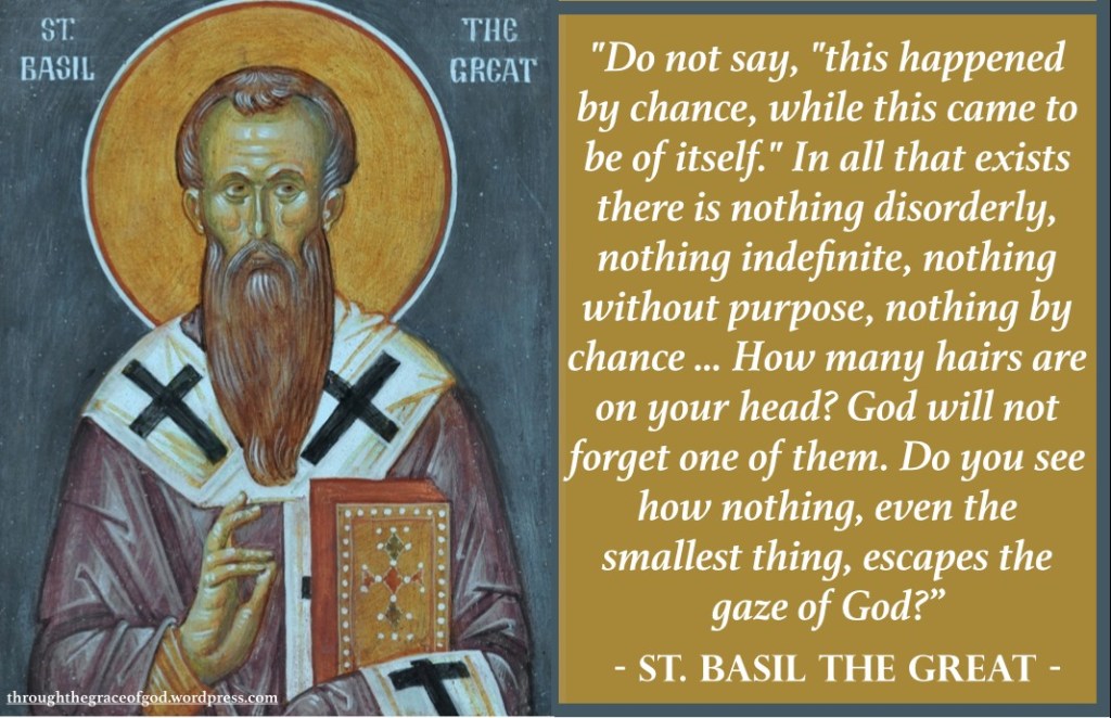 Zeg niet: “Dit gebeurde toevallig, terwijl dit vanzelf ontstond.” In alles wat bestaat, is er niets wanordelijks, niets onbepaalds, niets doelloos, niets toevalligs… Hoeveel haren heb je op je hoofd? God zal er niet één vergeten. Zie je hoe niets, zelfs het kleinste ding, aan Gods blik ontsnapt?”