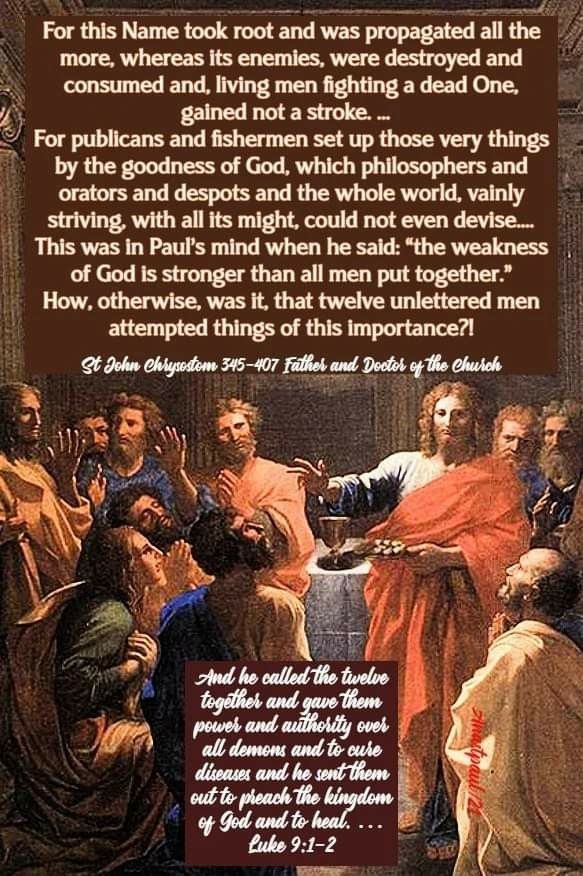 Want deze Naam schoot wortel en werd des te meer verspreid, terwijl zijn vijanden werden vernietigd en verteerd en, levende mensen die een dode bestreden, geen enkele slag kregen. … Want tollenaars en vissers hebben precies die dingen opgezet, door de goedheid van God, die filosofen en redenaars en despoten en de hele wereld, die ijdel met al haar macht streefden, niet eens konden bedenken. … Dit was in Paulus’ gedachten toen hij zei: ” de zwakheid van God is sterker dan alle mensen bij elkaar. “