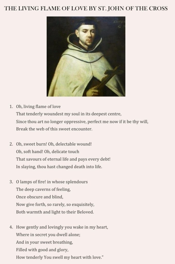 [Hier is het gedicht van St. John of the Cross ” Living Flame of Love “, afkomstig uit The Poems of St. John of the Cross, bewerkt en vertaald door Marjorie Flower, OCD. St. John of the Cross was een priester en karmeliet monnik uit de 16e eeuw, die sterk beïnvloed werd door St. Teresa van Avila. Hij is het meest bekend om zijn spirituele poëzie en geschriften, zoals Dark Night of the Soul .]
