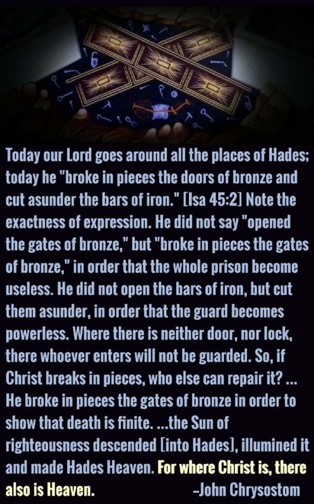 Vandaag gaat onze Heer rond op alle plaatsen van Hades; vandaag “brak hij de deuren van brons in stukken en sneed de ijzeren staven door.” (Jesaja 45:2) Let op de nauwkeurigheid van de uitdrukking. Hij zei niet “opende de poorten van brons,” maar “brak de poorten van brons in stukken,” zodat de hele gevangenis nutteloos wordt. Hij opende de ijzeren staven niet, maar sneed ze door, zodat de bewaker machteloos wordt. Waar geen deur, geen slot is, zal wie binnenkomt niet bewaakt worden. Dus, als Christus in stukken breekt, wie kan het dan repareren? … Hij brak de poorten van brons in stukken om te laten zien dat de dood eindig is. …de Zon van gerechtigheid daalde neer [in Hades], verlichtte het en maakte Hades tot Hemel. Want waar Christus is, daar is ook de Hemel.