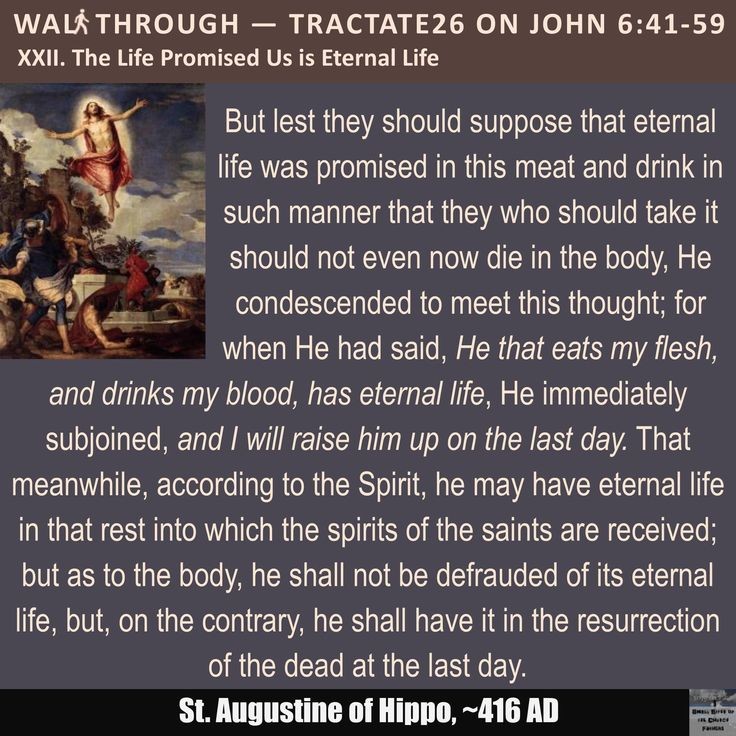 Maar opdat zij niet zouden veronderstellen dat het eeuwige leven in dit vlees en deze drank zodanig werd beloofd dat zij, die het innemen, in het lichaam niet zouden sterven, daalde Hij neder om aan deze gedachte tegemoet te komen; want toen Hij had gezegd: “Wie mijn vlees eet en mijn bloed drinkt, heeft eeuwig leven,” voegde Hij er onmiddellijk aan toe: “en Ik zal hem op de laatste dag opwekken.” Intussen, overeenkomstig de Geest, zal hij het eeuwige leven mogen hebben in die rust waarin de geesten der heiligen worden opgenomen; maar wat het lichaam betreft, zal hij niet beroofd worden van zijn eeuwige leven, maar integendeel: hij zal het verkrijgen in de opstanding der doden op de laatste dag.