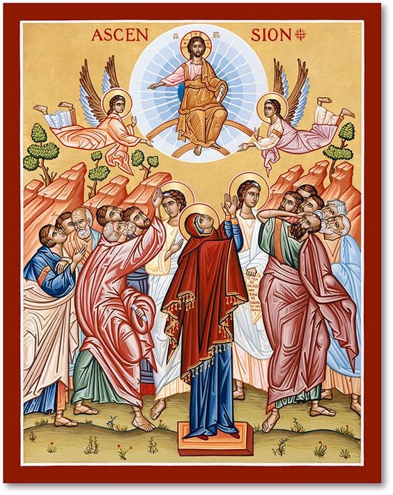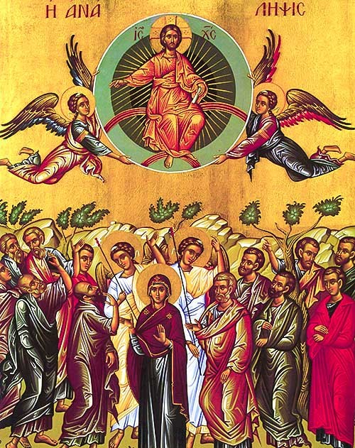 De Apostelen, neergeknield, keerden naar Jerusalem terug met grote vreugde ‘, zoals vermeld in de Handelingen der Apostelen, en de liturgie van het feest straalt van vreugde. Het heil is vervuld, maar de zegen van Christus, dat objectief gezien vervuld was : ‘De handen opheffend zegende hij hen’ zegt Sint Lucas. Welnu, ‘Terwijl hij hen zegende, verwijderde Hij zich van hen en werd ten hemel opgenomen’. De Heer stijgt op al zegenend, en de icoon maakt hiervan de spil van de samenstelling. Deze zegening vormt de aanloop naar Pinksteren, de zending van de Heilige Geest (zo mooi voorgesteld in de basiliek van Vézelay). Men kan zeggen dat de icoon van hemelvaart de épiclese van Pinksteren uitbeeld, het moment waar ‘ ik zal bidden tot de Vader opdat hij een andere helper zou zenden, om voor altijd met U te zijn ‘ (Joh.14,16) De épiclese is een aanroeping tot de Vader opdat Hij de Heilige Geest zou zenden, en dit feit wordt voortdurend herhaald tijdens de liturgie van het feest:‘Gij zijt verheven in de glorie, Christus onze God, nadat giij uw leerlingen met vreugde hebt vervuld door de aankondiging van de heilige Geest, zij werden bevestigd door Uw zegen’. ‘ De heer is opgestegen… om het gevallen beeld van Adam te herstellen en ons de helper-Geest te zenden, opdat hij onze zielen zou heiligen…’. Men ziet heel duidelijk de diepere bron van de vreugde der apostelen, die opstraalt ondanks het vertrek, want de belofte blijft : ‘ Ik ben met U alle dagen, tot aan het einde der tijden’ (Matth.28,20). Een tegenspraak voor de rede, maar is een evidentie voor de Geest. In het het Kondakion van het feest wordt dit treffend verwoord: ‘ door de goddelijke economie, voor wat ons betreft, te hebben vervuld en door alle bewoners der aarde te hebben verenigd met hen die in de hemel zijn, zijt Gij opgestegen in glorie om er voor altijd te verblijven, en Gij zegt tot hen die u liefhebben : Ik ben met U en niemand zal over ons kunnen zegevieren’. Na de hemelvaart is Christus op een andere wijze onder ons, meer verinnerlijkt0 Hij is niet meer voor zin leerlingen, lijfelijk aanwezig, maar in hun innerlijk : Hij is aanwezig in elke uiting van de Heilige Geest zoals Hij aanwezig is in de Eucharistie.