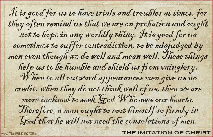 “Het is goed voor ons om soms beproevingen en moeilijkheden te hebben, want ze herinneren ons er vaak aan dat we op proef zijn en niet op enige wereldse zaak moeten hopen. Het is goed voor ons om soms te lijden onder tegenspraak, om verkeerd beoordeeld te worden door mensen, zelfs als we goed doen en het goed bedoelen. Deze dingen helpen ons nederig te zijn en beschermen ons tegen ijdelheid. Wanneer mensen ons naar alle uiterlijke schijn geen eer geven, wanneer ze niet goed over ons denken, dan zijn we meer geneigd om God te zoeken die onze harten ziet. Daarom moet een man zich zo stevig in God wortelen dat hij de troost van mensen niet nodig heeft.”