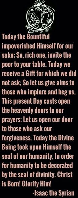 Vandaag heeft de Barmhartige Zichzelf verarmd voor ons; Dus, rijke, nodig de armen uit aan je tafel. Vandaag ontvangen we een Geschenk waarvoor we niet hebben gevraagd; Dus laten we aalmoezen geven aan degenen die smeken en bedelen. Deze huidige Dag opent de hemelse deuren voor onze gebeden; Laten we onze deur openen voor degenen die om onze vergeving vragen. Vandaag heeft het Goddelijke Wezen de zegel van onze menselijkheid op Zich genomen, zodat de mensheid versierd kan worden met het zegel van goddelijkheid. Christus is Geboren! Verheerlijk Hem!