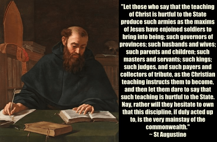 “Laat degenen die beweren dat de leer van Christus schadelijk is voor de staat, maar eens zulke legers voortbrengen als de maximen van Jezus soldaten hebben opgedragen voort te brengen; zulke gouverneurs van provincies; zulke echtgenoten en echtgenotes; zulke ouders en kinderen; zulke meesters en dienaren; zulke koningen; zulke rechters, en zulke betalers en belastinginners, zoals het christelijk onderricht hen leert te worden — en laat hen dan nog durven zeggen dat die leer schadelijk is voor de staat. Neen, veeleer zullen zij zich schamen om niet te erkennen dat deze levenswandel, als zij correct wordt nageleefd, juist de voornaamste steunpilaar van het staatsbestel is.”