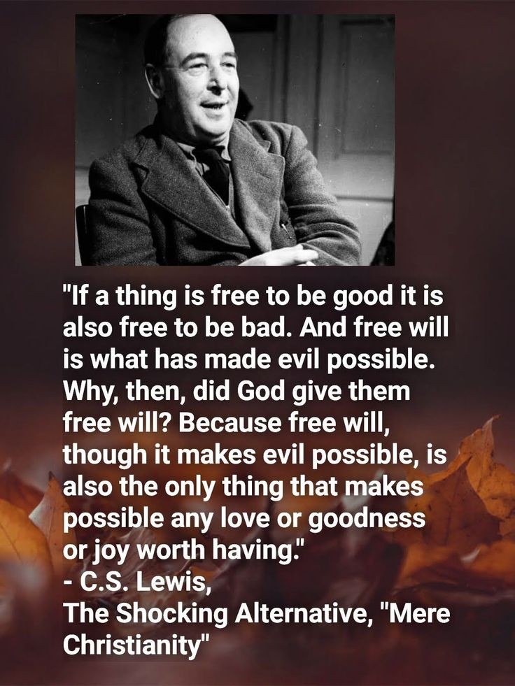 “Als iets vrij is om goed te zijn, is het ook vrij om slecht te zijn. En vrije wil is wat kwaad mogelijk heeft gemaakt. Waarom gaf God hen dan vrije wil? Omdat vrije wil, hoewel het het kwaad mogelijk maakt, ook het enige is dat liefde, goedheid of vreugde de moeite waard maakt.”