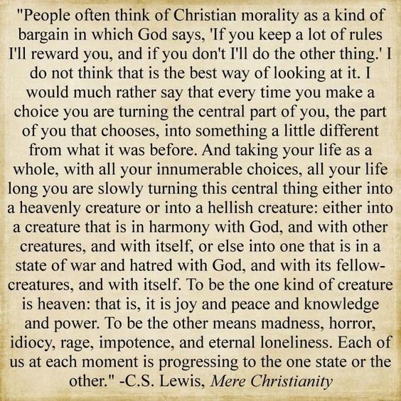 Mensen beschouwen de christelijke moraal vaak als een soort afspraak waarbij God zegt: “Als je je aan veel regels houdt, zal ik je belonen, en als je dat niet doet, zal ik iets anders doen.” Ik denk niet dat dit de beste manier is om ernaar te kijken. Ik zou veel liever zeggen dat elke keer dat je een keuze maakt, je het centrale deel van jou, het deel van jou dat kiest, verandert in iets dat een beetje anders is dan voorheen. En als je je leven in zijn geheel neemt, met al je ontelbare keuzes, verander je je hele leven lang langzaam dit centrale ding in een hemels wezen of in een hels wezen: ofwel in een wezen dat in harmonie is met God, en met andere wezens. schepselen, en met zichzelf, of anders in een staat van oorlog en haat tegen God, en tegen zijn medeschepselen, en tegen zichzelf. Het enige soort schepsel zijn is de hemel: dat wil zeggen: het is vreugde, vrede, kennis en macht. De ander zijn betekent waanzin, afschuw, idiotie, woede, onmacht en eeuwige eenzaamheid. Ieder van ons evolueert op elk moment naar de ene of de andere staat. (Boek 2, deel 4)