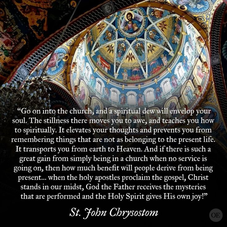 “Ga de kerk binnen, en een geestelijke dauw zal je ziel omhullen. De stilte daar brengt je tot ontzag en leert je hoe je geestelijk kunt zijn. Het verheft je gedachten en voorkomt dat je dingen herinnert die niet tot het huidige leven behoren. Het transporteert je van de aarde naar de hemel. En als er zo’n grote winst is van simpelweg in een kerk zijn wanneer er geen dienst gaande is, hoeveel voordeel zullen mensen dan halen uit aanwezig zijn… wanneer de heilige apostelen het evangelie verkondigen, Christus in ons midden staat, God de Vader de mysteries ontvangt die worden uitgevoerd en de Heilige Geest Zijn eigen vreugde geeft!”