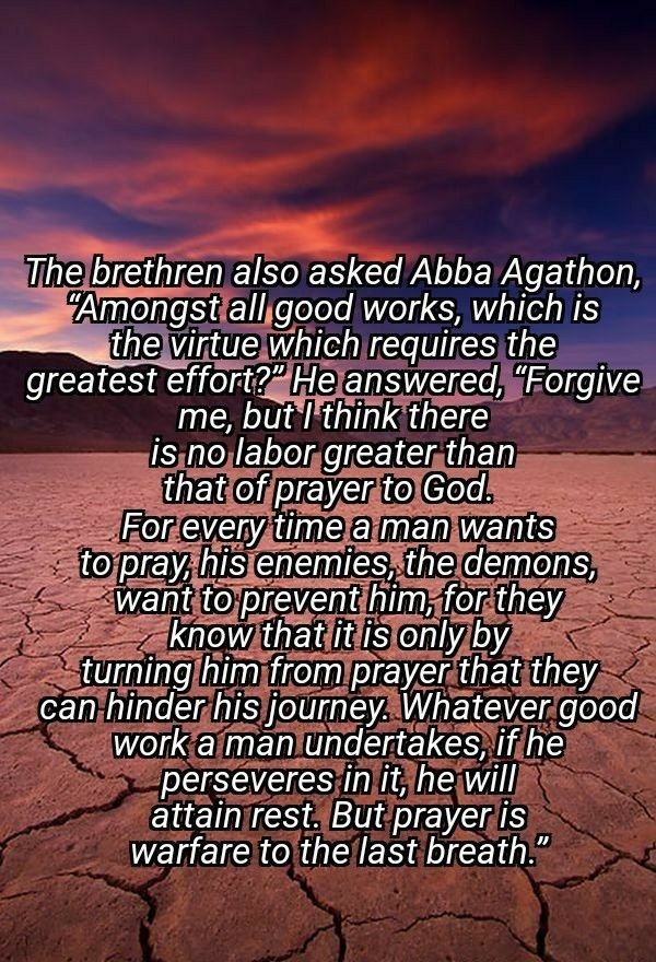 De broeders vroegen ook aan Abba Agathon: “Onder alle goede werken, welke deugd vereist de grootste inspanning?” Hij antwoordde: “Vergeef me, maar ik denk dat er geen arbeid groter is dan die van het gebed tot God. Want elke keer dat een man wil bidden, willen zijn vijanden, de demonen, hem verhinderen, want zij weten dat het alleen door hem van het gebed af te houden is dat zij zijn reis kunnen hinderen. Wat voor goed werk een man ook onderneemt, als hij volhardt, zal hij rust bereiken. Maar gebed is strijd tot de laatste adem.”