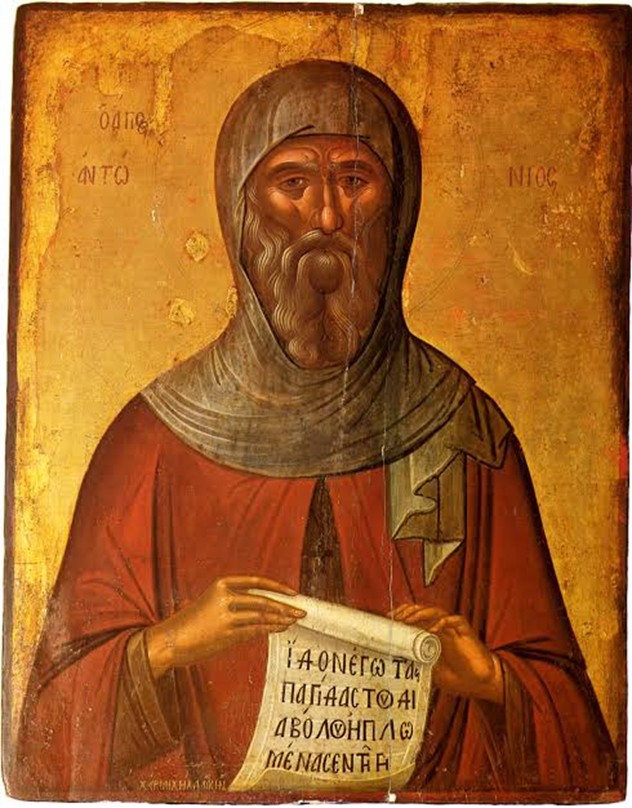 Antonius werd in 250 in Egypte geboren. Op 20-jarige leeftijd, toen zijn ouders stierven, zorgde Anthony ervoor dat de opleiding van zijn jongere zus kon worden voltooid in een gemeenschap van heilige vrouwen. Vervolgens verkocht hij al zijn bezittingen en vertrok voor een leven van eenzaamheid in de woestijn. Daar leerde een oudere kluizenaar hem over gebed en boetedoening. 20 jaar lang leefde hij in afzondering. Anthony wilde God diep leren kennen. Hij deed boete door slechts één keer per dag bij zonsondergang alleen brood en water te nemen. De duivel verscheen hem in vreselijke gedaanten om hem te verleiden. Maar Antonius had een groot vertrouwen in God. Anthony’s ongewone leven maakte hem niet hard, maar stralend van Gods liefde en mededogen.