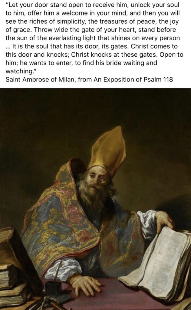 “Laat je deur openstaan om hem te ontvangen, ontgrendel je ziel voor hem, bied hem een welkom in je geest, en dan zul je de rijkdom van eenvoud, de schatten van vrede, de vreugde van genade zien. Gooi de poort van je hart wijd open, sta voor de zon van het eeuwige licht dat op elke persoon schijnt… Het is de ziel die zijn deur, zijn poorten heeft. Christus komt naar deze deur en klopt; Christus klopt aan deze poorten. Open voor hem; hij wil binnenkomen, om zijn bruid te vinden die wacht en kijkt.”