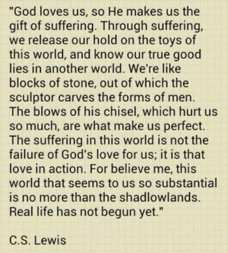 [Dit citaat van C.S. Lewis zit vol lagen, dus laten we het stap voor stap ontrafelen. Het draait in essentie om hoe lijden — hoe pijnlijk ook — een diepere functie kan hebben in ons leven vanuit een spiritueel perspectief. Hier zijn de belangrijkste ideeën: