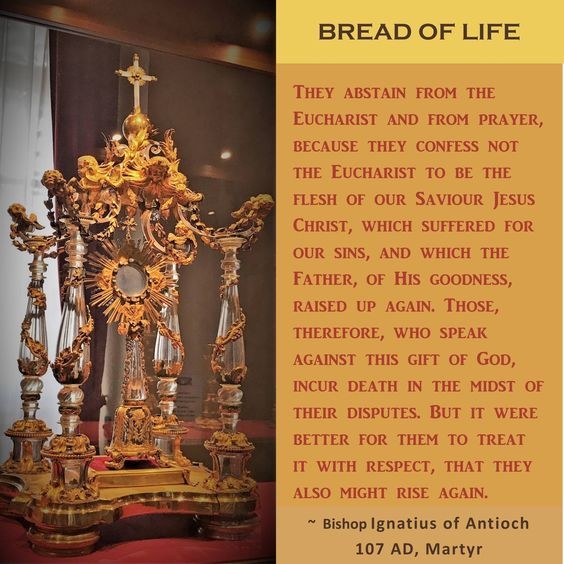 Dit citaat van Ignatius van Antiochië komt uit zijn Brief aan de Smyrnaeërs, geschreven rond het jaar 107 na Christus, terwijl hij als gevangene onderweg was naar Rome om daar de marteldood te ondergaan. Het is een van de oudste en krachtigste getuigenissen van het geloof in de werkelijke tegenwoordigheid van Christus in de Eucharistie.