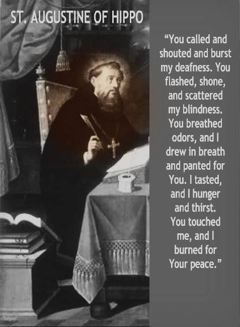 “U riep en schreeuwde en brak door mijn doofheid heen. U flitste, straalde, en verstrooide mijn blindheid. U ademde geuren, en ik inhaleerde en verlangde naar U. Ik proefde, en nu honger en dorst ik. U raakte me aan, en ik brand voor Uw vrede.”