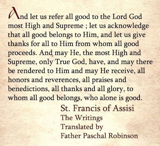 “En laten we al het goede toeschrijven aan de Heer God, de Allerhoogste en Opperste; laten we erkennen dat al het goede aan Hem toebehoort, en laten we Hem danken voor alles van Hem van wie al het goede voortkomt. En moge Hij, de Allerhoogste en Opperste, de enige ware God, hebben, en moge Hem alles worden gegeven en moge Hij ontvangen, alle eer en eerbied, alle lof en zegeningen, alle dank en alle glorie, aan wie al het goede toebehoort, die alleen goed is.”