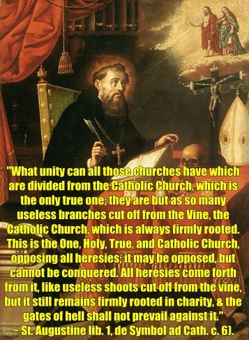 “Welke eenheid kunnen al die kerken hebben die gescheiden zijn van de Katholieke Kerk, die de enige ware is; zij zijn slechts zoveel nutteloze takken afgesneden van de Wijnstok, de Katholieke Kerk, die altijd stevig geworteld is. Dit is de Ene, Heilige, Ware en Katholieke Kerk, die alle ketterijen bestrijdt; het kan worden bestreden, maar niet overwonnen. Alle ketterijen komen voort uit haar, zoals nutteloze scheuten afgesneden van de wijnstok, maar zij blijft stevig geworteld in de liefde, en de poorten van de hel zullen niet tegen haar standhouden.”