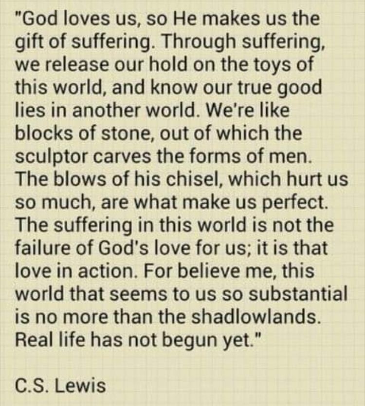 “God houdt van ons, en daarom schenkt Hij ons het lijden. Door het lijden laten we los wat ons aan de speeltjes van deze wereld bindt, en ontdekken we dat ons ware goed in een andere wereld ligt. We zijn als steenblokken, waaruit de beeldhouwer de vorm van mensen houwt. De slagen van zijn beitel – die ons zo pijn doen – zijn juist wat ons tot perfectie vormt. Het lijden in deze wereld is geen bewijs van het falen van Gods liefde; het is die liefde in werking. Want geloof mij, deze wereld die ons zo tastbaar lijkt, is slechts de schaduwwereld. Het echte leven moet nog beginnen.”