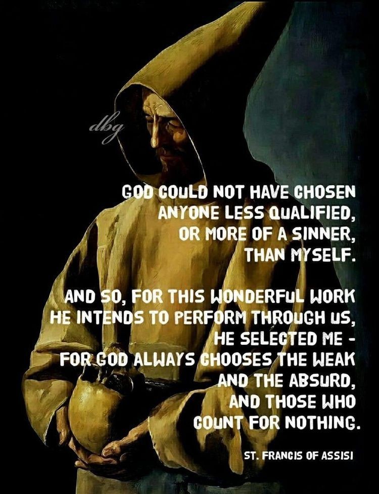 “God kon niemand minder gekwalificeerd, of meer een zondaar, dan ikzelf hebben gekozen. En dus, voor dit prachtige werk dat Hij door ons wil uitvoeren, heeft Hij mij uitgekozen – want God kiest altijd de zwakken en de absurde, en degenen die voor niets tellen.”