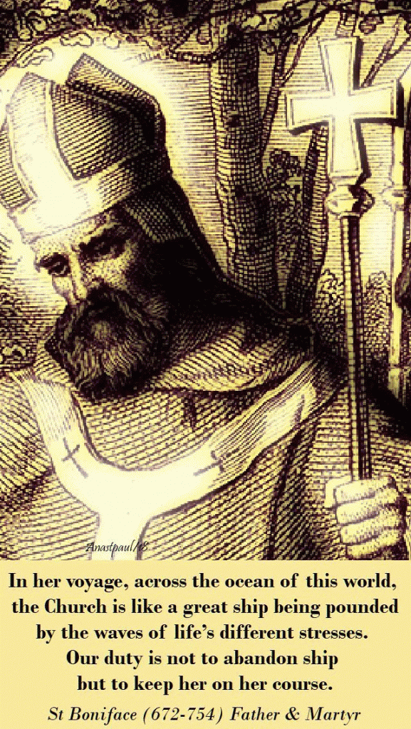 Bonifatius roept op om het schip niet te verlaten, dus om trouw te blijven aan de Kerk en het geloof, zelfs als het moeilijk is. Je moet helpen het schip op koers te houden, wat wil zeggen: bijdragen aan het geloof, gemeenschap, gebed en hoop.