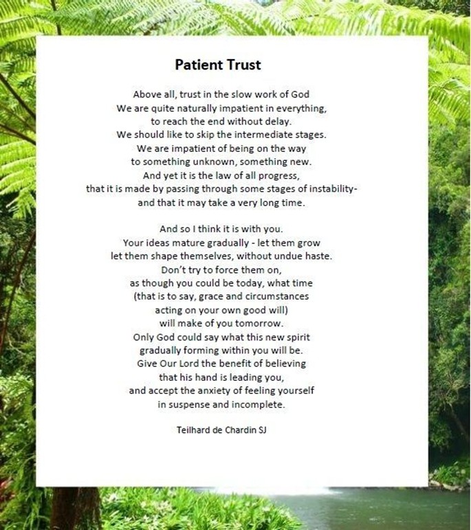 Bovenal, vertrouw op het langzame werk van God. We zijn van nature nogal ongeduldig in alles, om meteen het einddoel te bereiken. We zouden de tussenstappen liever overslaan. We zijn ongeduldig om op weg te zijn naar iets onbekends, iets nieuws. En toch is het de wet van alle vooruitgang dat die verloopt via fasen van instabiliteit – en dat dit lang kan duren.