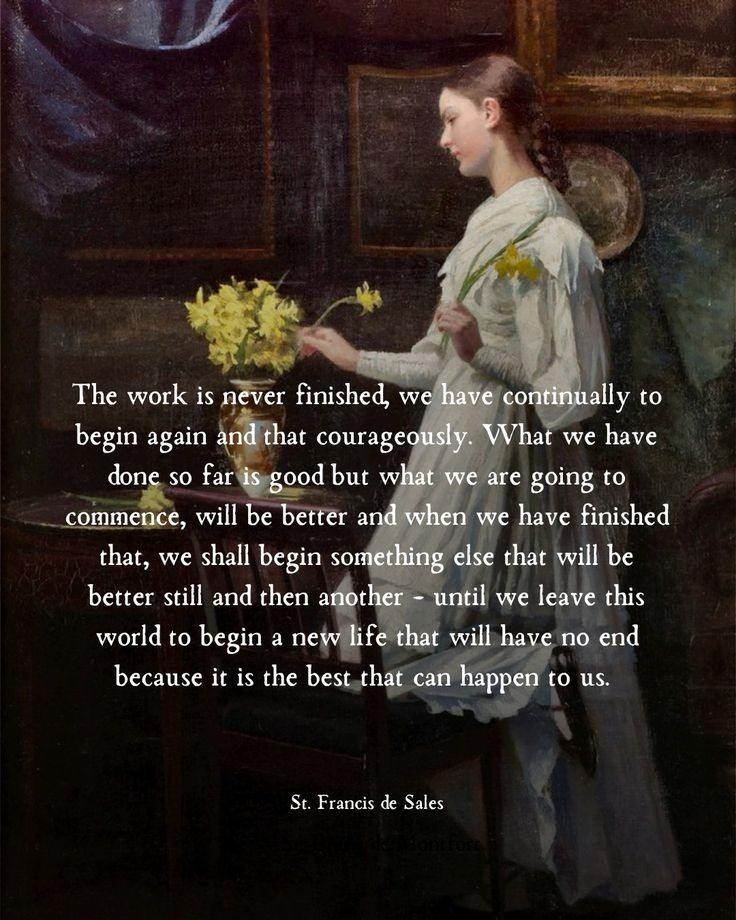 “Het werk is nooit af, we moeten voortdurend opnieuw beginnen – en dat moedig. Wat we tot nu toe hebben gedaan is goed, maar wat we gaan beginnen, zal beter zijn. En wanneer we dat hebben voltooid, zullen we iets anders beginnen dat nog beter zal zijn, en dan weer iets anders – totdat we deze wereld verlaten om een nieuw leven te beginnen dat geen einde zal hebben, omdat het het beste is dat ons kan overkomen.”