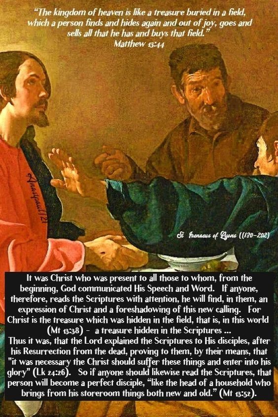 Zo was het dat de Heer de Schriften aan Zijn discipelen uitlegde, na Zijn opstanding uit de dood, hen bewijzend, door hun middel, dat “het noodzakelijk was dat Christus deze dingen zou lijden en in Zijn heerlijkheid zou binnengaan” (Lk 24:26). Dus als iemand op dezelfde manier de Schriften leest, zal die persoon een perfecte discipel worden, “zoals het hoofd van een huishouden die uit zijn voorraadkamer zowel nieuwe als oude dingen tevoorschijn haalt.” (Mt 13:52).