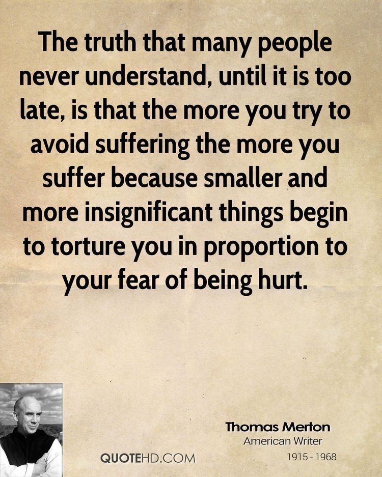 “De waarheid die veel mensen nooit begrijpen, totdat het te laat is, is dat hoe meer je probeert lijden te vermijden, hoe meer je lijdt omdat kleinere en onbeduidendere dingen je beginnen te kwellen in verhouding tot je angst om gekwetst te worden.”