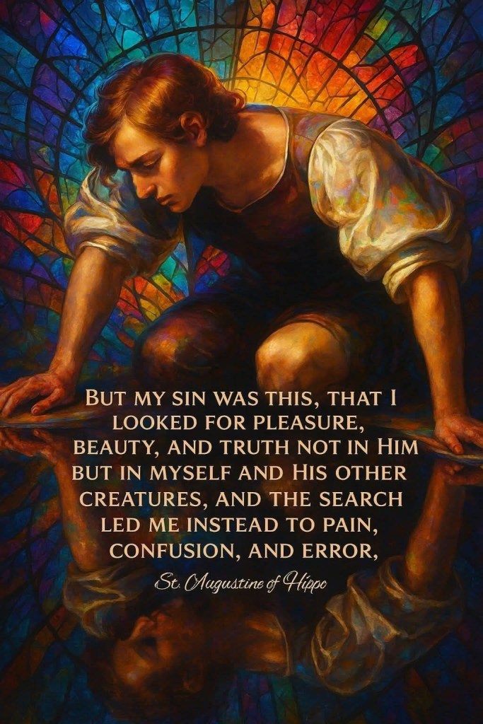“Maar mijn zonde was dit: dat ik plezier, schoonheid en waarheid zocht, niet in Hem, maar in mijzelf en in Zijn andere schepselen. En die zoektocht bracht mij niet tot vreugde, maar tot pijn, verwarring en dwaling.”