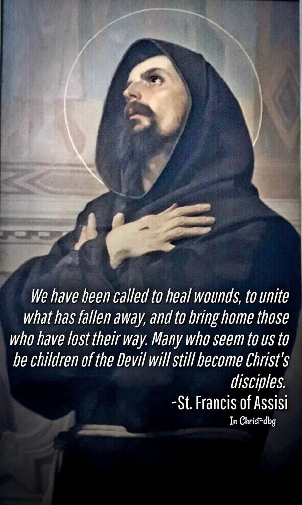 Heer van vrede en genezing, Gij die ons roept om wonden te helen en verloren zielen thuis te brengen, leer ons zien met de ogen van Franciscus—ogen die niet oordelen, maar hopen. Geef ons de moed om te blijven liefhebben waar anderen afwijzen, om te blijven geloven in de kracht van uw genade, zelfs in hen die ver van U lijken. Laat ons handen zijn die verbinden, woorden die troosten, en harten die ruimte maken voor uw wonderlijke omkering. Moge uw licht schijnen in de duisternis, en uw liefde ons leiden naar het herstel van alles wat gevallen is.