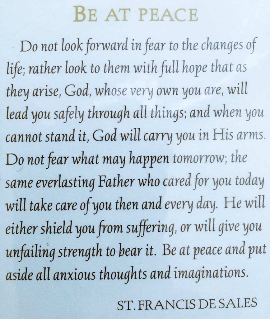 Kijk niet vol angst vooruit naar de veranderingen van het leven; kijk er liever naar met volle hoop, want wanneer ze zich voordoen, zal God—aan wie jij toebehoort—je veilig door alles heen leiden. En wanneer je het niet meer kunt verdragen, zal God je dragen in Zijn armen. Vrees niet wat morgen kan gebeuren; dezelfde eeuwige Vader die vandaag voor je zorgde, zal ook dan en elke dag voor je zorgen. Hij zal je óf beschermen tegen het lijden, óf je onvermoeibare kracht geven om het te dragen. Wees in vrede en leg alle angstige gedachten en verbeeldingen naast je neer.