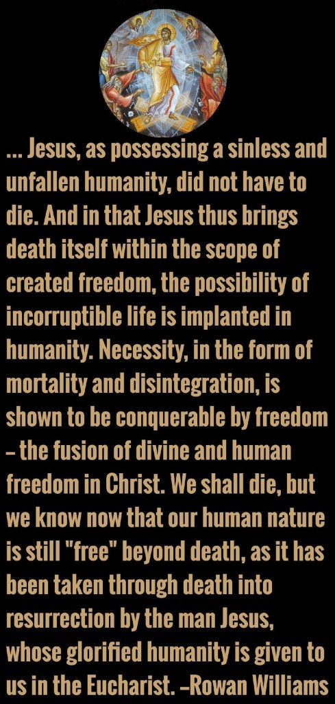 Jezus, als bezitter van een zondeloze en niet-gevallen menselijkheid, hoefde niet te sterven. En doordat Jezus de dood zo binnen het bereik van geschapen vrijheid brengt, wordt de mogelijkheid van een onvergankelijk leven in de mensheid geplant. Noodzaak, in de vorm van sterfelijkheid en ontbinding, blijkt overwonnen te kunnen worden door vrijheid – de versmelting van goddelijke en menselijke vrijheid in Christus. Wij zullen sterven, maar we weten nu dat onze menselijke natuur nog steeds “vrij” is voorbij de dood, omdat zij door de dood heen is meegenomen in de verrijzenis door de mens Jezus, wiens verheerlijkt mens-zijn ons wordt geschonken in de Eucharistie.