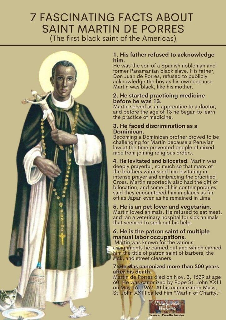 1.Zijn vader weigerde hem te erkennen. Hij was de zoon van een Spaanse edelman en een voormalige zwarte slavin uit Panama. Zijn vader, Don Juan de Porres, weigerde de jongen publiekelijk als zijn zoon te erkennen omdat Martinus zwart was, net als zijn moeder.