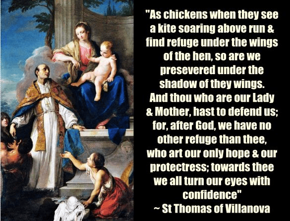 Deze beeldrijke vergelijking — kuikens die schuilen onder de vleugels van hun moeder — is diep geworteld in de Bijbelse traditie (vgl. Psalm 91:4, Matteüs 23:37). Thomas van Villanova spreekt hier over Maria als moederlijke toevlucht, niet als vervanging van God, maar als diens doorgeefluik van troost en bescherming. Zijn woorden ademen een kinderlijke overgave: na God is zij onze enige hoop. Dit is geen theologische absolutie, maar een mystieke erkenning van Maria als veilige schuilplaats in tijden van geestelijke dreiging.