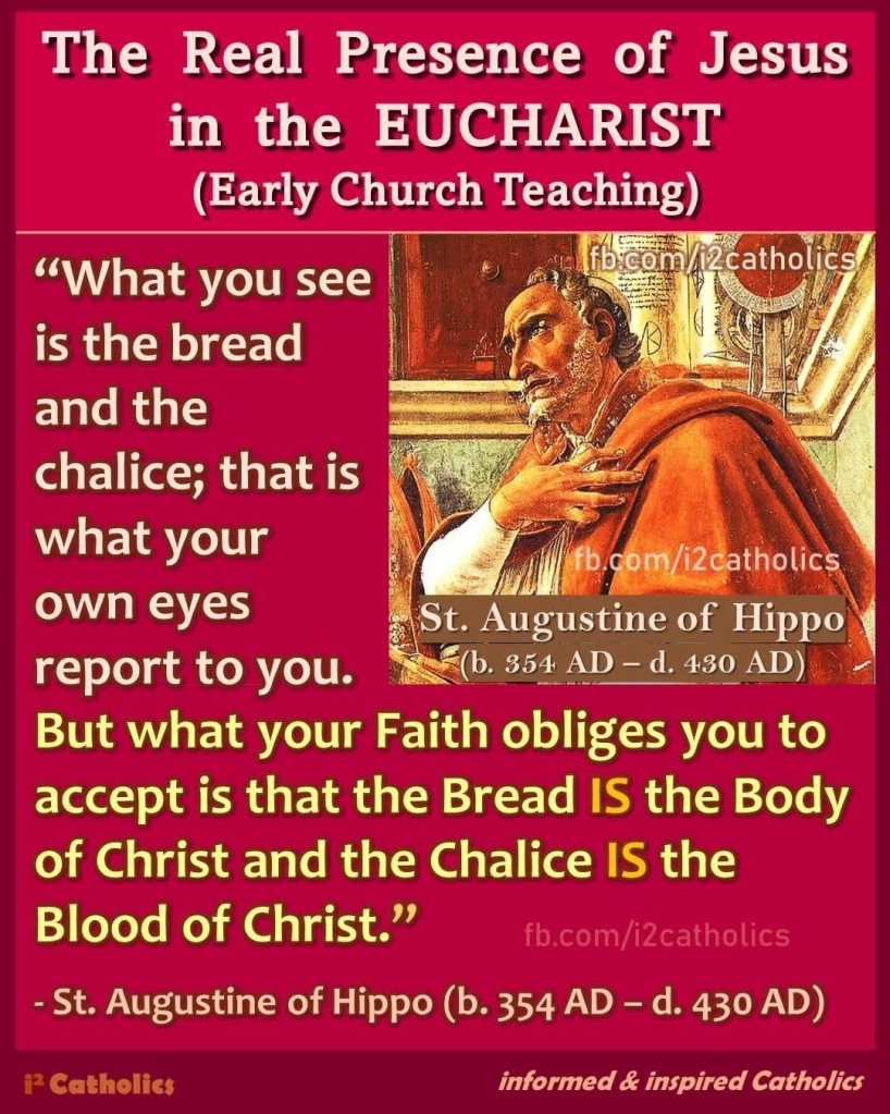 Deze uitspraak van Sint-Augustinus is een krachtige bevestiging van wat in de katholieke traditie de werkelijke tegenwoordigheid van Christus in de Eucharistie wordt genoemd. Hij maakt een onderscheid tussen zintuiglijke waarneming en geloofskennis: onze ogen zien brood en wijn, maar ons geloof erkent dat deze tekenen door de kracht van Christus’ woorden en de Heilige Geest werkelijk zijn veranderd in zijn Lichaam en Bloed.