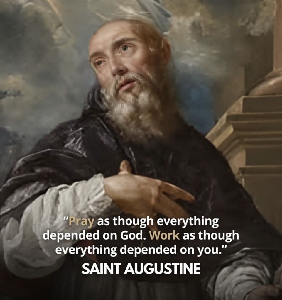 Deze uitspraak van Augustinus is een krachtige samenvatting van christelijke spiritualiteit: een dynamische balans tussen vertrouwen en verantwoordelijkheid. Hij nodigt ons uit tot een leven waarin gebed geen vlucht is, maar een fundament — en waarin werk geen bewijsdrang is, maar een roeping.